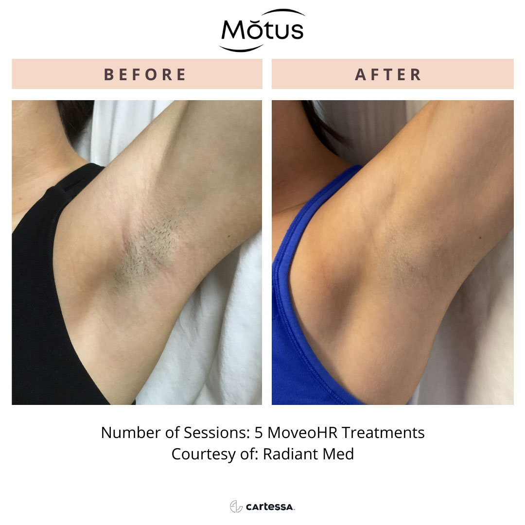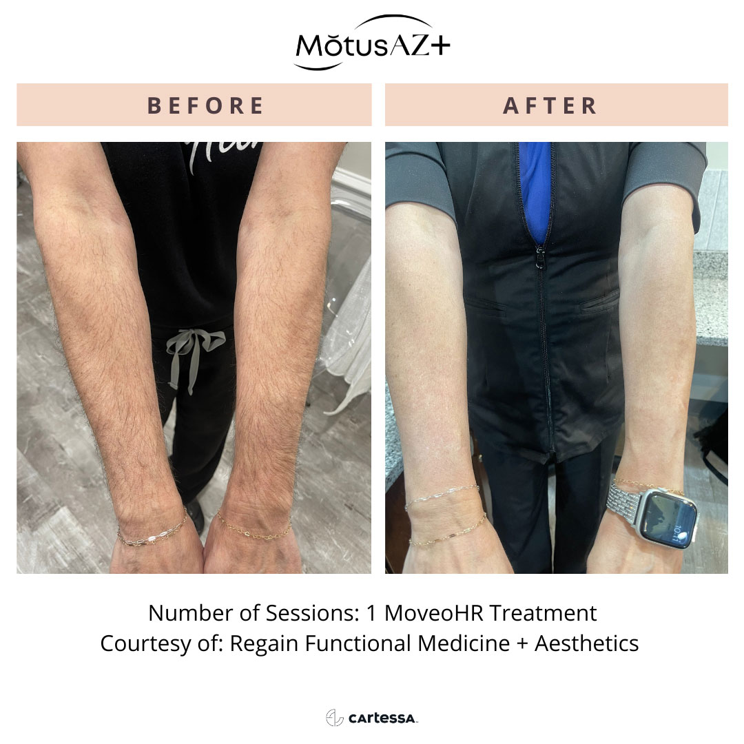 Your treatment begins with a gentle cleanse of the skin. Using the Motus AZ+, your provider glides a specialized sapphire-tipped handpiece across the area in smooth, continuous motions. This advanced “in-motion” technique gradually delivers energy to the hair follicle, allowing for a far more comfortable experience than traditional laser methods. This is a new painless method. Because hair grows in cycles, a series of treatments spaced a few weeks apart is recommended for optimal, lasting results.