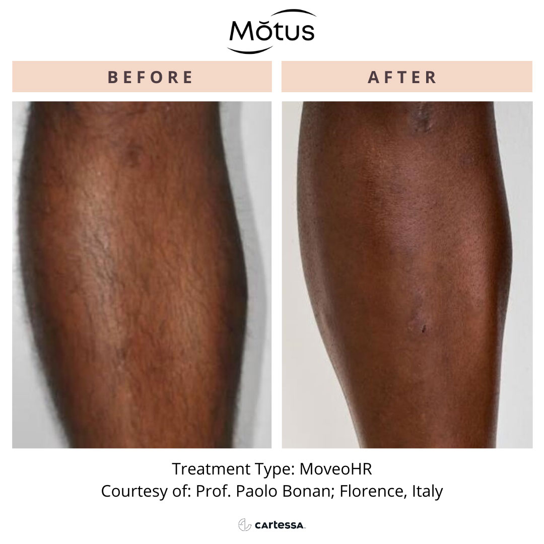 No. The Motus AZ+ was designed to be painless. The Motus AZ+ uses gradual heating rather than sudden pulses; this eliminates the previously experienced sharp “snap” sensation many associate with laser hair removal. Combined with its cooling sapphire tip, most clients find the treatment warm, relaxing, and exceptionally well-tolerated.